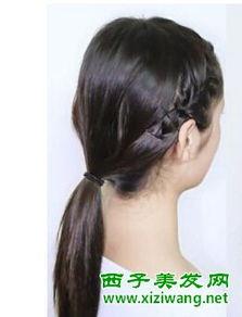 4. 鱼骨辫马尾:先将头发分成两股,然后像编鱼骨辫一样,将两股头发交叉编织,最后将编织好的头发扎成马尾。